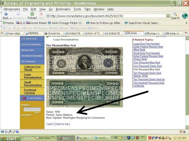 Según los E.E.U.U. Oficina de impresión y del grabado página web titulada "para coleccionistas: denominaciones grandes: cinco mil sello azul," se imprimieron billetes de $5000 en 1918. El frente del proyecto de ley contó con James Madison, y la parte posterior ofreció Washington renunció a su Comisión.