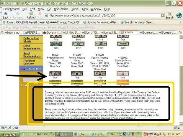 Notas de la moneda de denominaciones por encima de $100 no están disponibles en el Departamento de Hacienda, el sistema de Reserva Federal, o la oficina de grabado e impresión. El 14 de julio de 1969, el Departamento de Hacienda y el sistema de la Reserva Federal anunció que moneda notas en denominaciones de $500, $1.000, $5.000 y $10.000 se suspendería inmediatamente debido a la falta de uso. Aunque fue publicados hasta 1969, se imprimieron última en 1945.