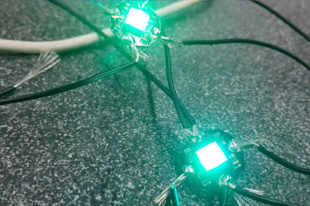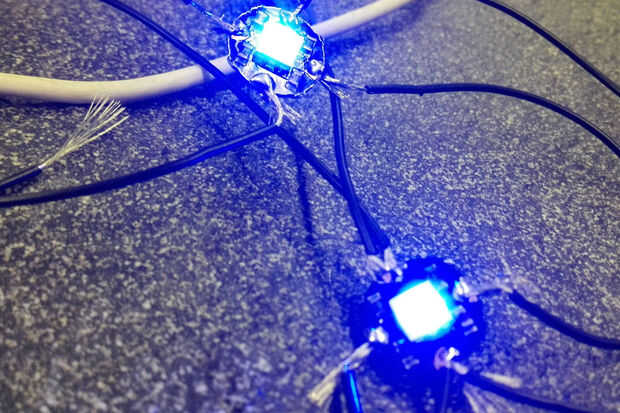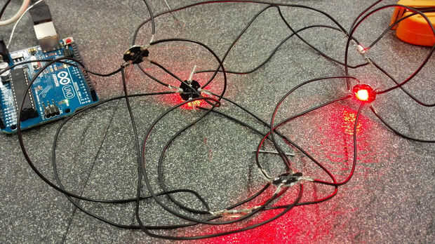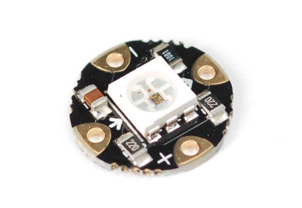 Queríamos crear una ropa que cambia de color cuando se mueve. Hemos utilizado 20 Neopixels para crear una larga cadena de luces. Tuvimos que soldar todos los pros a los pros, los contras a los contras y la salida a la entrada de la siguiente Neopixel. Se utilizó un adaptador de 5V y 1 amperio para soldadura a Neopixels para poder suficiente.