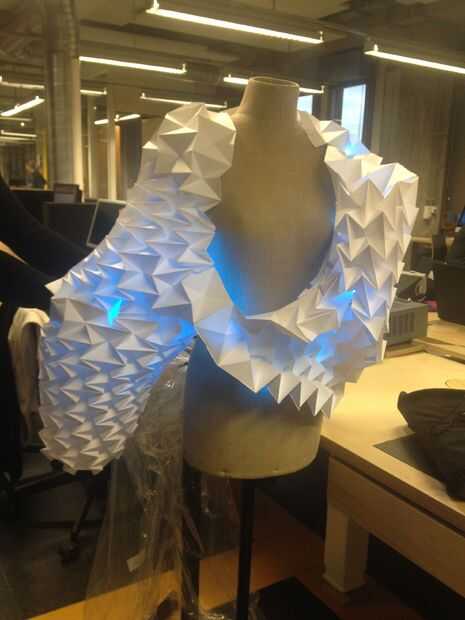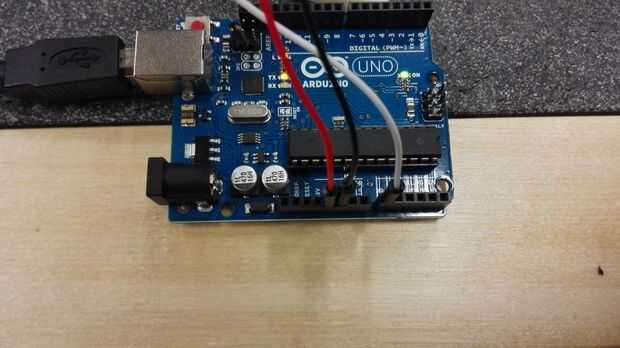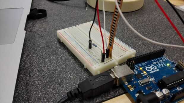 Decidimos que queríamos cambiar el color de azul cuando los brazos estaban dobladas (bajo consumo) al rojo cuando los brazos se estiran hacia fuera (alta potencia). En orden a medir cuando los brazos se estiró o doblado se utilizó un sensor Flex. Nos soldadas dos hilos de rosca más a este sensor por lo que podríamos poner en una pulsera textil que puede llevar alrededor de su codo. El sensor se colocará en el interior del codo y se doblará si los brazos doblados o estirados cuando los brazos se estiran hacia fuera.