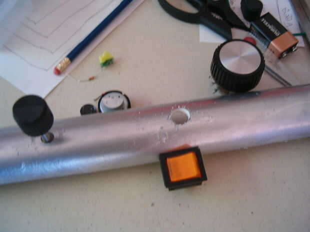 empezar, alineando todos sus controles (potenciómetros, interruptores, indicador LED etc.) a donde quieres que vaya en su tubo y poner puntos en la pintura con el rotulador. entonces con tus pinzas de medir la parte de su control que llevará a cabo el control en la pared de la tubería (ver foto 3). a continuación encuentra la broca apropiada. probablemente desee poner el control en un vicio, pero si no tienes uno simplemente ir lento y el pedacito de taladro no agarra el tubo y hace pivotar alrededor (pero nuevamente tuve una prensa del taladro).