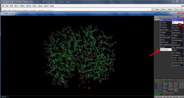 - Con el fin de representar la molécula como una superficie, ir a la caja de "S" (ver) a la derecha del nombre proteína, haga clic en, luego pasa el cursor sobre como. Desde allí, puede hacer clic en la opción de superficie.