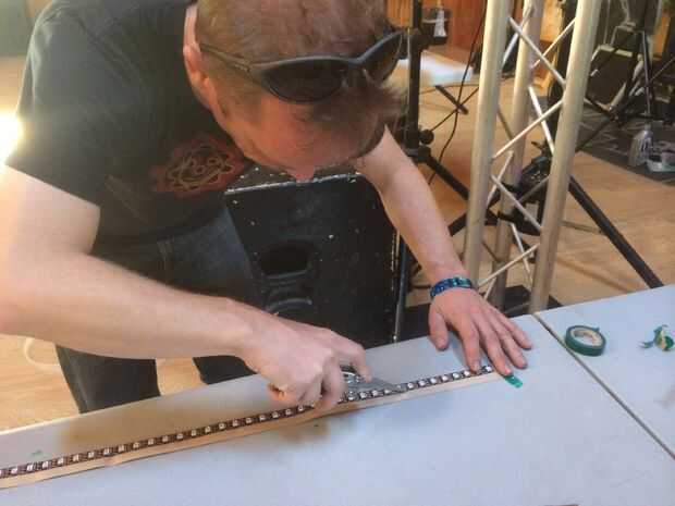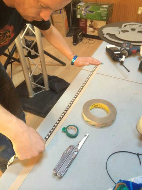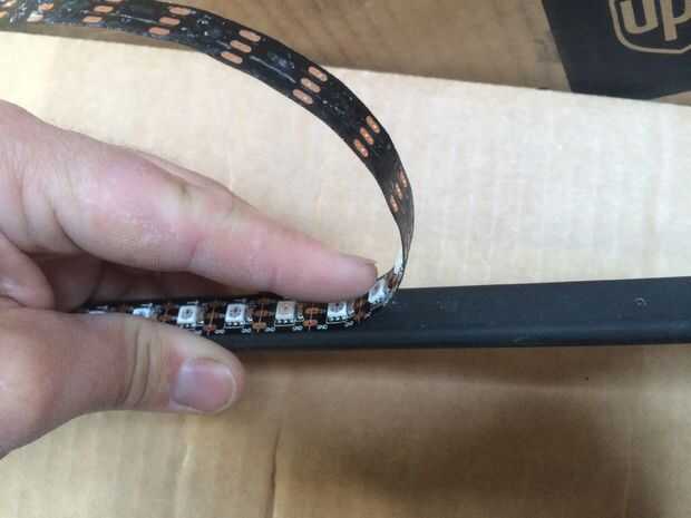 Para ello simplemente estirar un pedazo de la cinta de 3 M un poco más de la tira. Utilizar algunas otras cintas (hemos utilizado esa cinta aislante verde) para fijar el 3M cinta adhesiva hacia arriba a la mesa de cada extremo para mantener tensa. A continuación, puede utilizar ambas manos para colocar la tira de LED en línea recta. Un cuchillo del exacto entonces puede utilizarse para recorte el exceso de 3M de cinta. De la pluma, tiene un adhesivo en su franja.