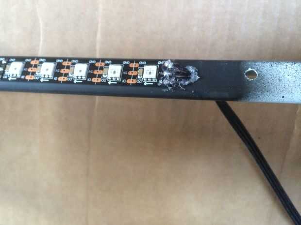 Las barras de la cortina eran blancas, por lo que hemos pintado plano negro y une la tira de LED. También perforó un agujero para pasar los cables y cargado lleno de pegamento caliente para aliviar la tensión y proteger el cableado de los bordes de metal.