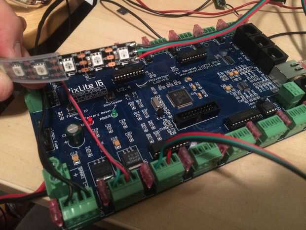 Existen algunas opciones diferentes para el LED de control desde un ordenador, pero uno de los PCB más fácil que he encontrado para trabajar con es el 16 de PixLite por Advantek. Esta placa tiene 16 canales de alrededor de 300 píxeles por canal, que funciona con protocolos diferentes tira direccionable 10 y habla ArtNet y CSN/E1.31. Además, si usted está usando en modo de CSN recibirá un adicional 4 universos de salida DMX. Como veremos en más a lo largo de la línea utilizaremos MadMapper así que vamos a tener que usar el modo de ArtNet, pero si usas Madrix o LightJams la salida de la CSN será útil.
