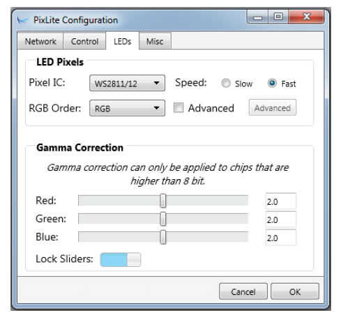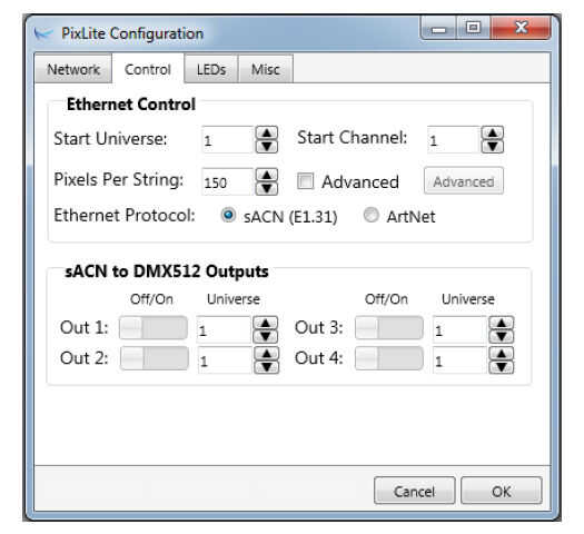 La empresa que fabrica este tablero cuenta con una herramienta de configuración que se utiliza para configurar el mapeo de ArtNet o CSN a cada puerto, así como le permite configurar la interfaz ethernet. También puede establecer el protocolo que se utilice para excitar los píxeles y el orden de bytes. En la última foto, se puede ver cómo el universo -> port mapping se hace. Marcando la casilla de verificación avanzado puede especificar la dirección exacta y el universo para cada puerto, o automáticamente asignará de manera llena. Utilicé las opciones avanzadas para configurar cada puerto de un universo diferente con una dirección de inicio de uno desde universos ArtNet son efectivamente libres y esto simplifica muchísimo la configuración en MadLight.