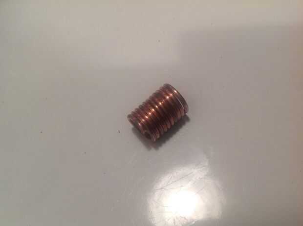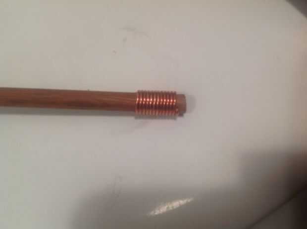 Después de que la bobina ha sido herida, use algunos cortadores para cortar el alambre que está dentro del orificio en el dowl. A continuación, deslice la bobina de la espiga. Debería verse como un resorte cobrizo.