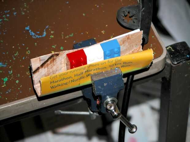 Observe que se apoderó de los ladrillos un poco fuera del centro. Esto me permite hacer un agujero en el ladrillo del centro sin golpear la barra de apoyo de la vice por debajo.