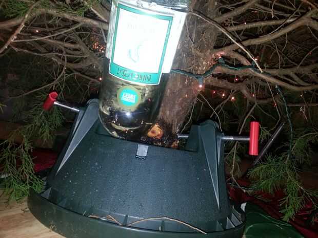 Tomar una botella de gran gemido, llenarlo con agua y pegar en el soporte para el árbol.