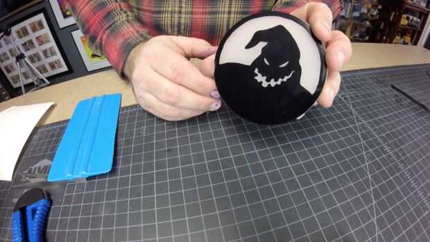 Mientras esperaba en el tinte se seque, me dirigí al establo con ese pedazo de acrílico que corte antes. Yo para dar un efecto esmerilado con chorro de arena luego aplica mi gráfico. Esto fue cortado con mi cortador del vinilo, pero puede imprimir un gráfico y recortar con tijeras y pegamento en el acrílico.