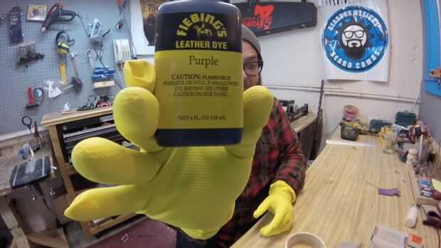 Compré el tinte de cuero de este Fiebing en amazon para bastante barato. Es un tinte de base de alcohol, como madera de tinte. Es muy potente y muy impresionante. Su guante para arriba o vas mirando los dedos púrpura para el próximo mes!