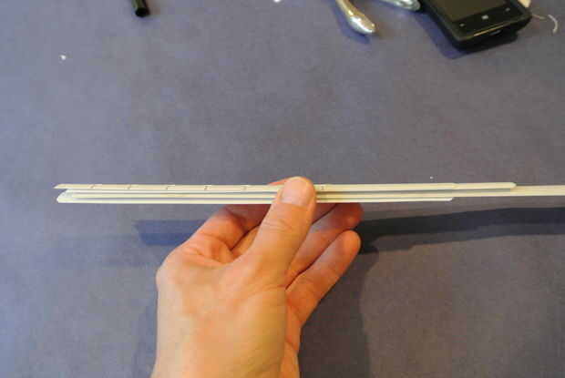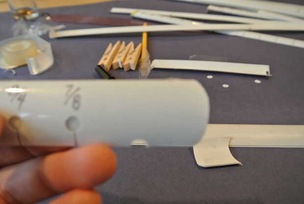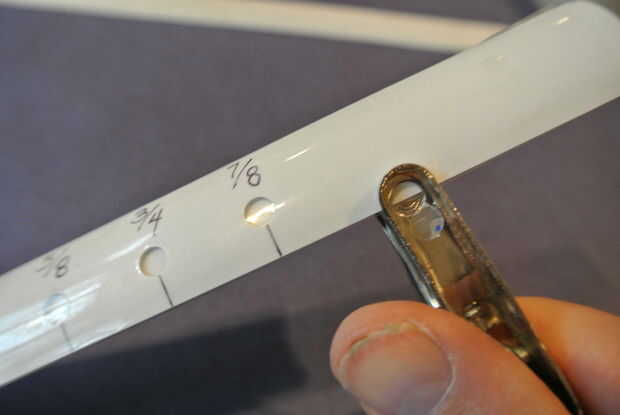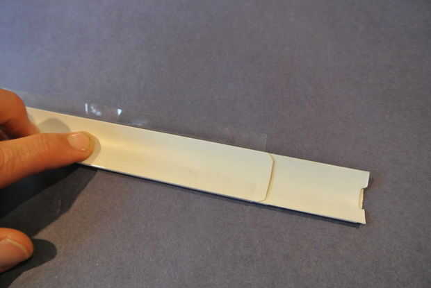 Corte y coloque una tira de lado pegajoso de la cinta del embalaje para arriba sobre la mesa. Lugar la diapositiva fraccionaria gobernó lado hacia abajo en la tira de cinta de embalaje. Emparedado de dos largos tramos de ciego entre las piezas superior e inferior, esto permite a la corredera moverse fácilmente una vez que se graba la diapositiva. Cuidadosamente la cinta por los bordes de la cinta sobre la pieza de fondo, que me gusta un desvío desde el cero de la diapositiva para que no interfiera con el gancho de la regla de pulgadas. Frote hacia abajo de la cinta y extracto de las secciones de espaciador de ciegos. Finalmente, perfore un borde de la diapositiva como un pulgar y redondear el extremo de la cola de la corredera.