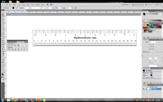 La forma más sencilla de obtener un patrón de regla es descargar uno en línea. Usé myonlineruler.com. La regla no automáticamente se puede dibujar a la escala adecuada, por lo que tendrá que importarlo en illustrator.