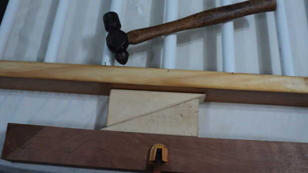 He utilizado maderas recicladas que vecinos han expulsado a la acera, por lo que el único dinero contante y sonante he presentado es $13,00 para la pipa y $1.00 para un conjunto de ruedas de 50mm toma de una tienda; incluso los tornillos son hardware recuperado. Corte y menores operaciones de carpintería completadas, cuadrado y el marco ensamblado y luego retrocedió a un lado de los tornillos del riel para permitir que un resbalón - en el ajuste de las secciones de tubería, luego apretó para captura final. Unos broches de latón Cruz de clavos en los tubos mediados mantiene el marco de arqueamiento y abandono de las tuberías. Acusado un sistema simple para empotrar la estructura en mi mesa de trabajo mientras que conduce los clavos, por lo que no se necesitan pinzas largo, los habituales como encontraron en la mayoría de las tiendas casa. Una simple parada en el lado opuesto completó el porta-piezas.