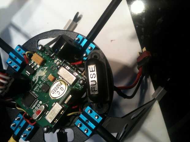 En realidad, la protección está diseñada más para lo que sucede en la tierra, antes de un vuelo. Siempre son mucking con los controles de la telemetría, comprobación de las conexiones de salida a los motores de DC de BDC (sin cepillo), conectar los cables del canal al receptor... etc. Una conexión en corto circuito o un conector polarizado conectado hacia atrás puede ser desastroso. Este fusible soplarán mucho antes de que cualquier daño está hecho y sin duda avisarle de algo que has hecho mal.