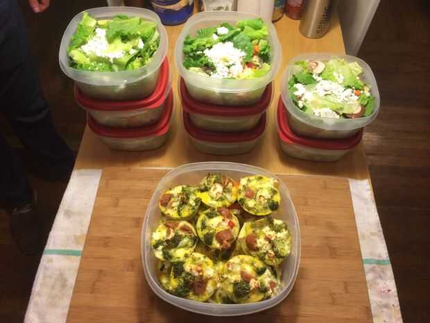 Después de meses de experimentar, he colocado en un hábito de cocinar que es casi perfecto: comida sana, deliciosa, relativamente asequible y rápida hacer. Todos los domingos ~ 2 horas de cocción y tener todas mis comidas para la semana preparada. Si bien hay dos comidas básicas: mini-frittatas y ensaladas — variaciones en ingredientes y aperitivos rellenarla y añadir variedad.
