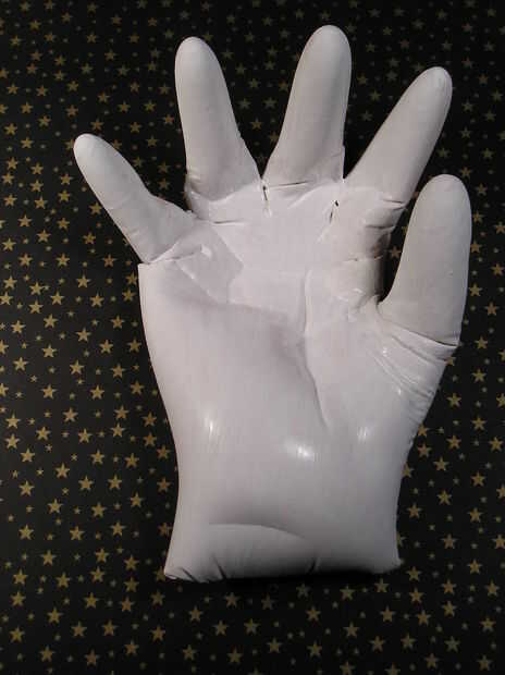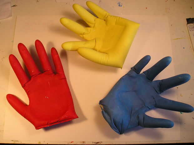 Realmente tuve unas manos por parte de un proyecto anterior. Todo lo que tenía que hacer era seleccionar uno y pintarlo blanco como capa base, añade las líneas de contorno con pintura gris. Para hacer las manos, usa un guante de látex estándar, lleno de yeso de París (mezclado por supuesto), dejó sentado hasta que duro y luego se retira guantes. Entonces solía arte pintura para pintar.
