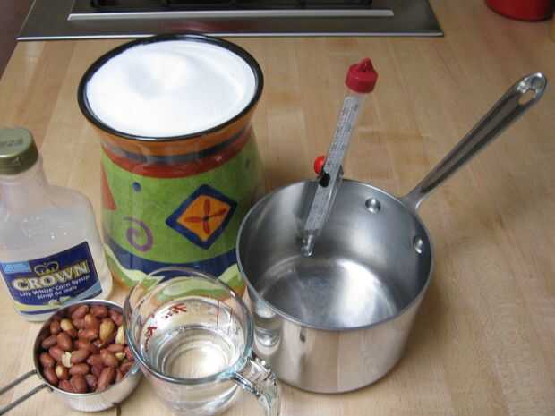 Poner el azúcar, el jarabe de maíz, agua y mantequilla en una cacerola de fondo pesado de 2 cuartos.
