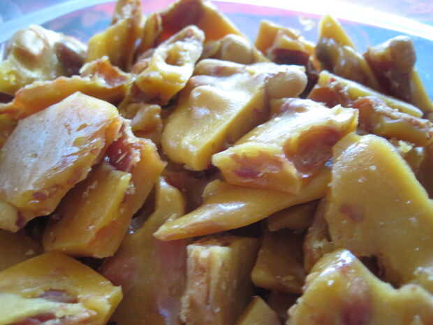Hervir, revolviendo frecuentemente, hasta que el caramelo thermometor registra 305 grados f el. Retire del fuego y agregar rápidamente el resto de los ingredientes. Verter sobre la hoja de hornada y la propagación tan fina como sea posible.