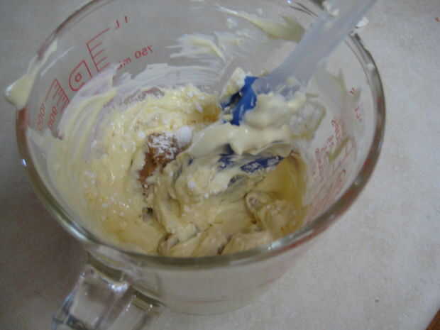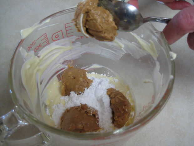 Para el segundo tipo de cheesecake, es blanco glaseado de azúcar y mantequilla de maní. 1/3 de la masa restante (aproximadamente 1 taza...) y añadir dos cucharadas de azúcar, Glas así como 1/4 de una taza de PB. Bllend hasta que es liso.