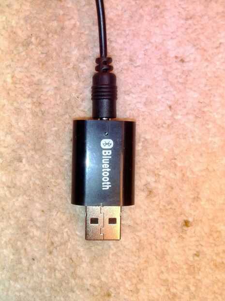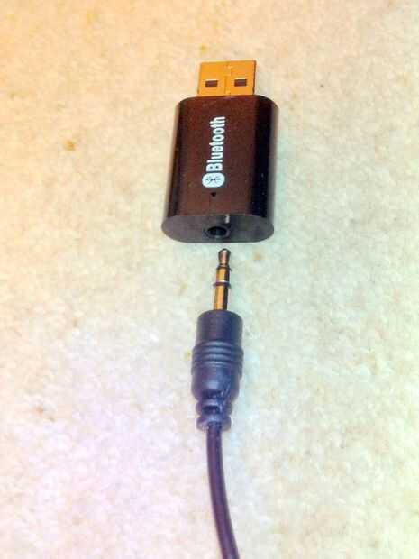 2) un receptor de audio Bluetooth barato con un macho puerto de Bus serie Universal (USB), una salida audio estéreo (3,5 mm hembra) Puerto y sin batería (como se muestra en la imagen). Dichos receptores están disponibles para 2-3£ £ en algunos de los sitios web de comercio electrónico popular. Si usted compra uno de esos recargables uno entonces usted tendrá que mantener a recargarlas.