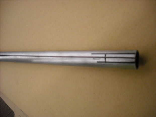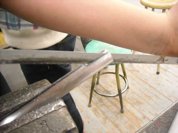 Ahora demostrar cortando las colas desde el extremo de la tubería a la línea a cortar. Está bien cortada en el otro lado del tubo. (Más adelante los niños cortará un ángulo de grados 45 en el extremo.) Niños encuentran este paso difícil. Asegúrese de que si es diestro se sostienen la manija con la mano derecha y de pie a la izquierda del tubo. Haz que pasen mucho tiempo simplemente tirando hacia atrás hasta que el corte se pone en marcha.