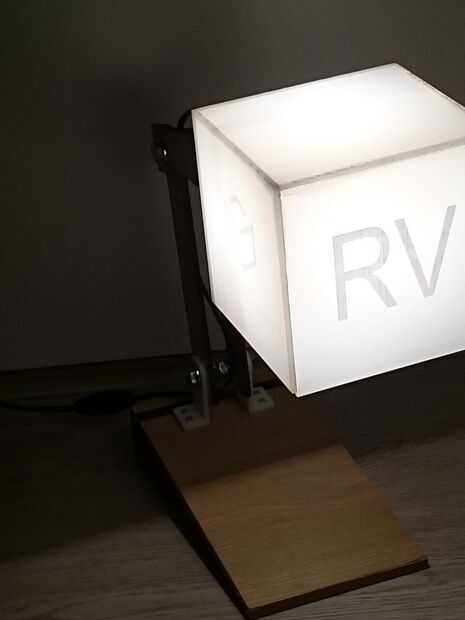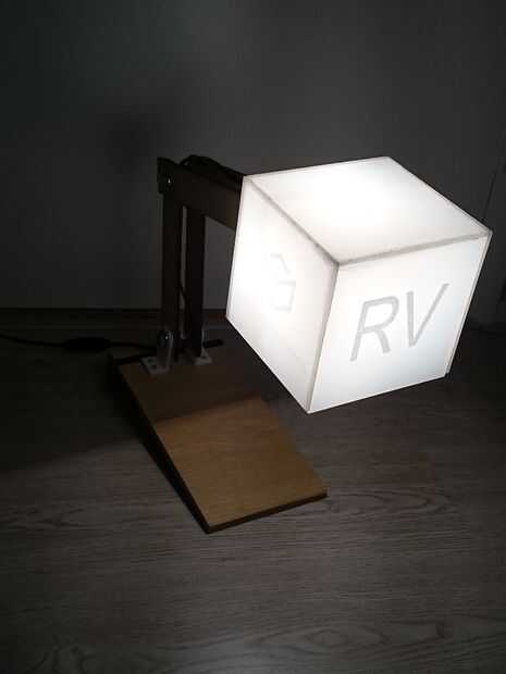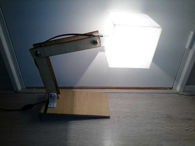 Antes de reducir 8, empecé a armar la lámpara. Empecé con el brazo mecánico. cual luego perforé en el stand. para el soporte utilicé un trozo de cubierta de la escalera. Cuando el brazo estaba armado con tornillos y tuercas, empecé a pegar las piezas de plexiglás para formar un cubo. Una vez que la exhibición fue formado, yo había pegado a la pieza que sostiene la bombilla en su lugar y poner el zócalo en él. Comencé a armar la lámpara sí mismo en el brazo. pero una vez que comencé a apretar los tornillos, la parte donde se adapta a la lámpara, se rompió. Tuve que pensar en una solución, porque ya estaba pegado.