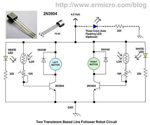 el robot simple se basa en doble LM393 comparador de voltajeLa función del circuito es para que coincida con la resistencia fotosensible y para proporcionar una tensión de referencia conveniente para el chip LM393.Debido a la diferente reflectividad