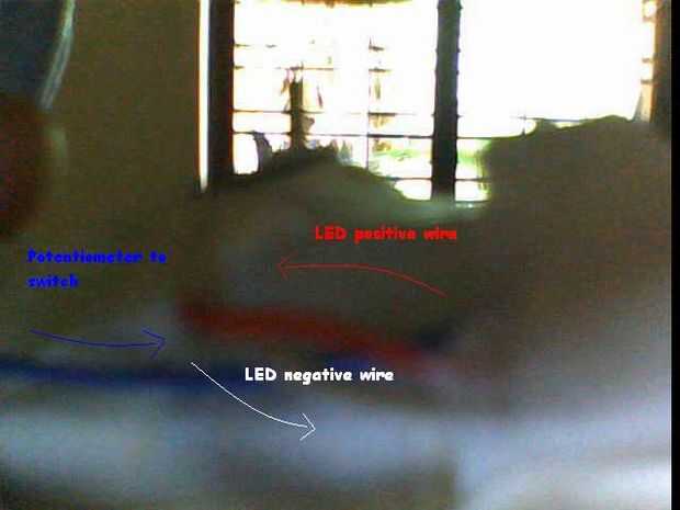 cable de la batería de un step.my simple no era grande así que conecté un cable blanco al negro,-ve wire.now que cable blanco va al lado de la LED.the lado rojo del potenciómetro va a - ve el + ve parte de la LED.now simplemente enciende el interruptor conectando el resorte o el jumper.is la bombilla encendida? ahora gire el potentiometer.is la bombilla que brilla intensamente más brillante o conseguir dimmer? si no , compruebe las conexiones y empezar a over.if funciona y su batería es recargable, vaya al paso siguiente.