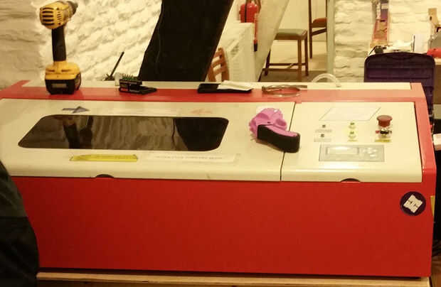 Que acabo de comprar un cortador del laser HPC para uso en hacer: Bromyard, encontré que el existente "mango" era algo molesto. Básicamente era sólo una ranura de corte la tapa de acero. Agarras con un dedo y ascensor, y eso está bien. Sin embargo, encontré demasiado fácil dejarlo pivote sobre en la parte superior y atrapar los dedos antes de que llegue a los topes. Como se puede ver en la foto, es básicamente un tragamonedas de perforada de la tapa antes de plegar, y así que decidí añadir una simple manija ergonómica.