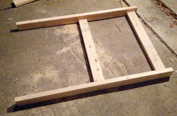 Similar a las patas delanteras, montar el bastidor de patas traseras utilizando el último D dos miembros y las dos piezas de la C. El travesaño inferior (a la derecha en esta foto) no debe ser al ras con los extremos de la pierna para que la tabla puede colocarse en la alfombra y sentarse en las piernas adecuadas. Este es 1" desde el final de la leg.