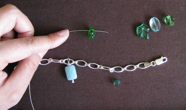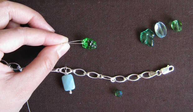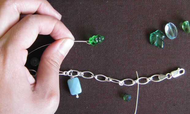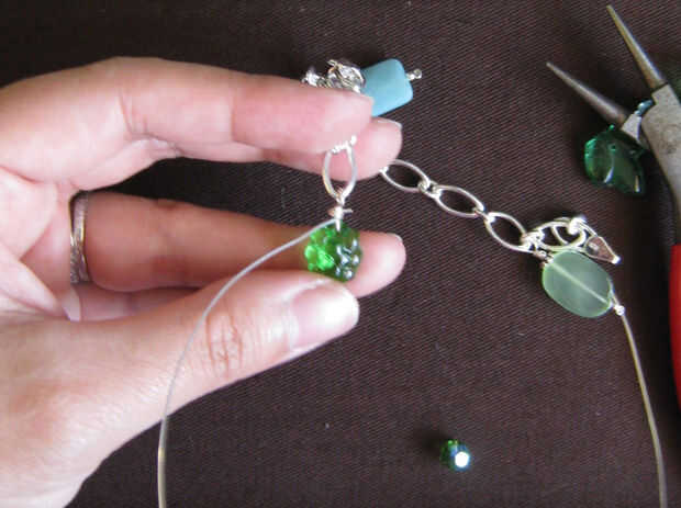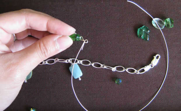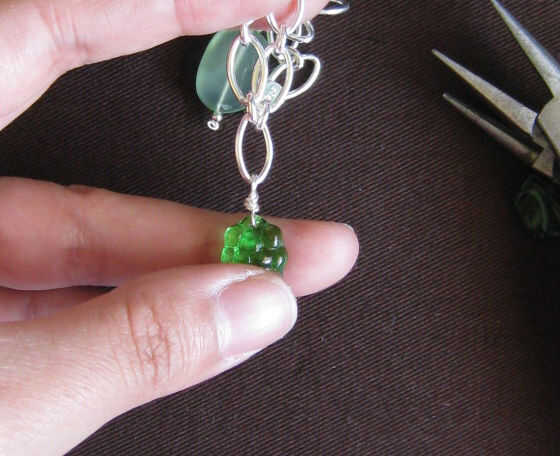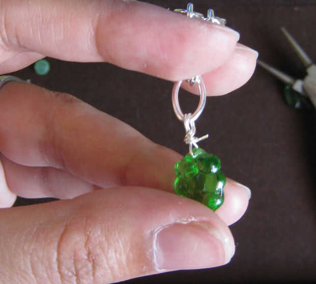4) Deslice la cadena en el lazo. Utilice alicates de punta plana para agarrar en el bucle y empezar a envolver. Otra vez, dos veces es suficiente. Corte al ras de los extremos.