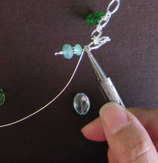 2) Introduzca la cadena y agarre el lazo con alicates de punta plana, envolver dos veces y guiar el cable hasta la parte inferior del talón.