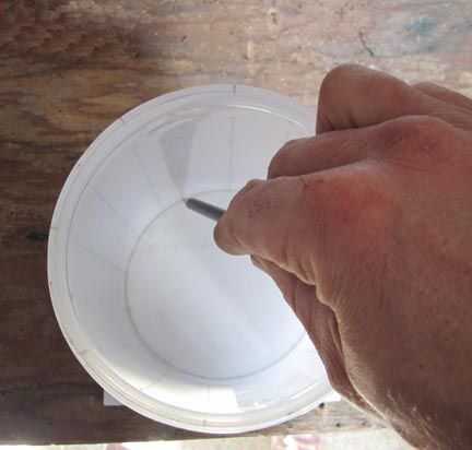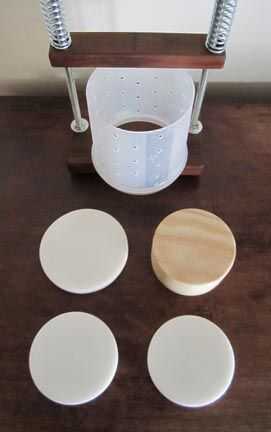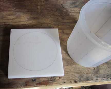 Las piezas pasadas hacer son la placa superior y los seguidores que transfieren la presión generada por los resortes para el queso. Tome la 5 "x 5" pedazo de tablero de corte plástico (estamos usando una tabla de cortar porque es alimento seguro y fácil de cortar) y traza un círculo en él desde el interior del extremo cortado del molde. Cortar el círculo solo un poco ancho con una sierra de calar, de archivo o arena al tamaño y suavizar los bordes. Se trata de la pieza que va directamente en la cuajada del queso. Luego, tome los dos madera 5 "x 5" trozos y hacer círculos de una 1/2" más pequeño en diámetro que la placa superior. Que quieras ser menor porque si mojan y se hincha la madera podría atascarse. Hice un seguidor de madera y plástico dos pero creo que dos los de madera sería mejor. Estos seguidores proporcionan la altura entre la placa superior y la barra inferior de la prensa. Pocas piezas diferentes permite adaptarse a diferentes cantidades de queso para ser presionado. También puede omitir hacer madera todos en conjunto e improvisar con latas de comida.