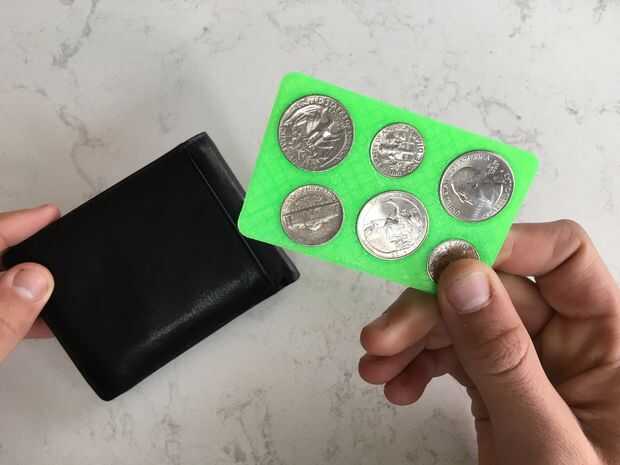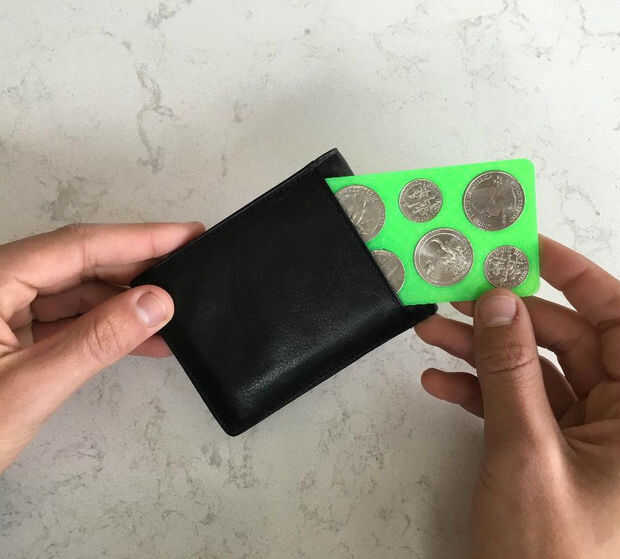 Cuando empecé a tener este problema surgió con la idea de un soporte de tamaño tarjeta de crédito que meter en mi cartera y mantener 100 centavos en monedas surtidas. Sólo he podido realizar este concepto recientemente cuando compramos una impresora 3D, pero estoy muy contenta con los resultados.