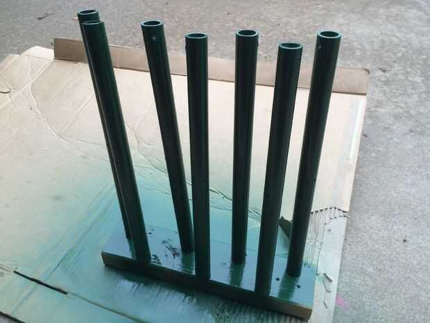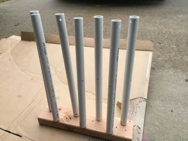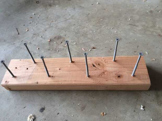 Para darle una capa completa en una sola toma, condujo solo algunos tornillos de 4 pulgadas en un trozo de madera para mantener vertical por lo que pude pintar todos los lados a la vez.