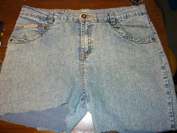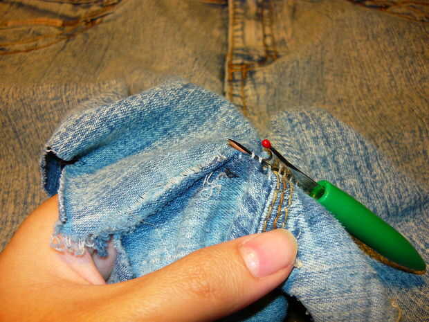Rasgar las costuras marcadas en la primera foto. Deshacer los lados hasta la longitud deseada de la bolsa interior (delantero de los pantalones, FOP para abreviar). Ayuda a hacerlo como se muestra en la segunda foto.