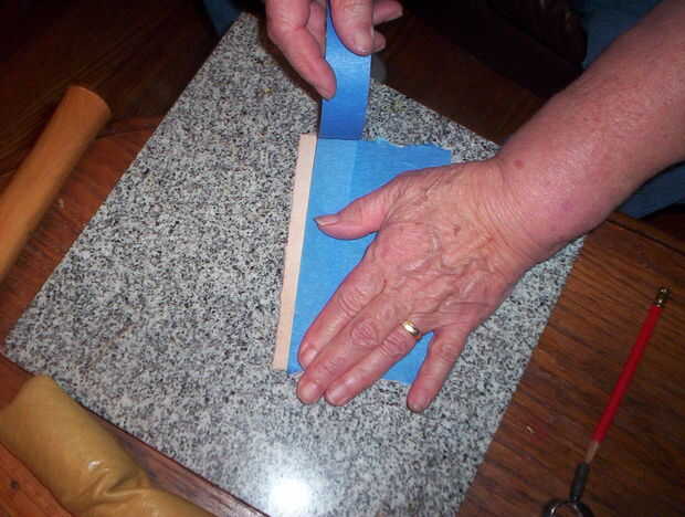 Tomar la cinta de enmascarar y cubrir la parte posterior o el lado rugoso de 6 1/2 x 4 pulgadas talla de cuero. Esto impide que el cuero estirando al mismo tiempo útiles. Humedezca el cuero de tallar con la esponja, lo suficiente como para oscurecer el cuero completamente. No quiere el cuero humedecido. Deje que la piel vuelva a casi su color natural.