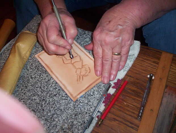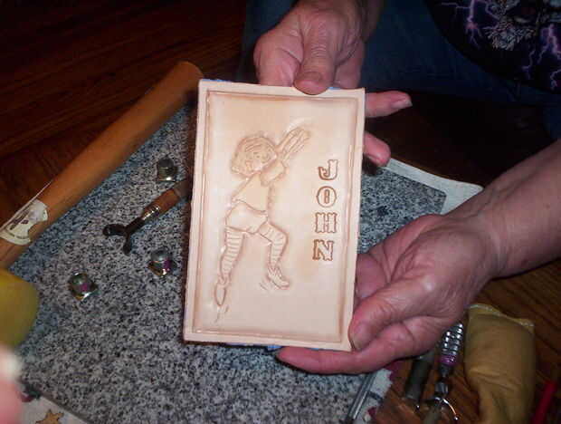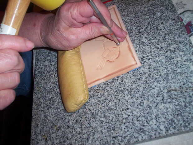 W está listo para cortar el patrón. Tomar el cuchillo del eslabón giratorio y antes de comenzar a cortar, strop la hoja. Esto evita que la hoja afilada. Me gusta usar el peso de la bolsa para mantener el cuero de moverse mientras estoy de herramientas. Esto es opcional. Sosteniendo el cuchillo verticalmente, corte todas las líneas exteriores, alrededor de su pelo, chaleco y pantalones. Hacer un corte de luz en el interior de la línea del cabello. Tome la herramienta B 197 y bisel a lo largo de la parte exterior de la figura, lejos del cuerpo. NO en bisel los dedos. En la zona del tobillo, debe cambiar para biselado hacia la pierna, para que la pierna va en el maletero. Biselar ligeramente la línea del cabello en la zona de la cara.