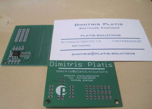 Es relativamente fácil de hacer una tarjeta de visita de PCB. Hay especialmente tres enfoques diferentes, desde el "más difícil" que ofrece más libertad para el más fácil, que limita el diseño creé pero solo tienes que editar un archivo de texto.