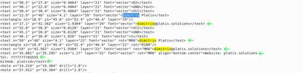Si no saben y no quieren aprender a usar estas herramientas, entonces guarde el archivo pcb_business_card.brd (click derecho + guardar enlace como) y ábralo con su editor de texto favorito. Observar que es básicamente un archivo XML.