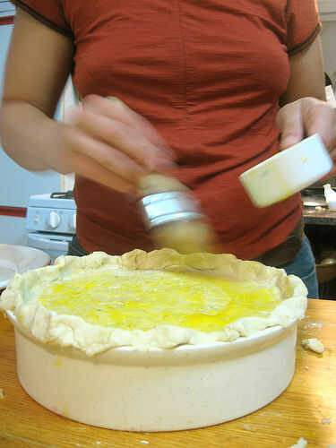 Si usted está haciendo un top de la corteza de su pie, repita el paso anterior para obtener la masa rodada hacia fuera. Usando una brocha de cocina, cepillo en la mezcla de huevo a las cortezas superior e inferior Únete.