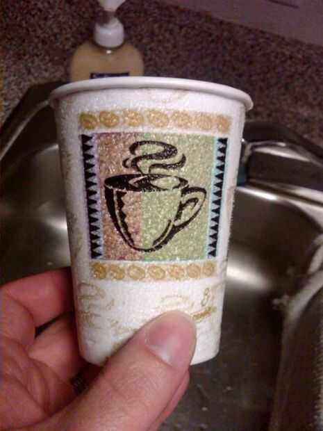Aquí vemos ye olde lanzamiento lejos taza de café. Mantenemos estos alrededor de cuando la gente pase por la oficina así que no tenemos que lavar para arriba después de ellos. Voltear boca abajo y corte la parte inferior. Utilicé un cortador de caja plegable, utilizar lo que funcione para usted.