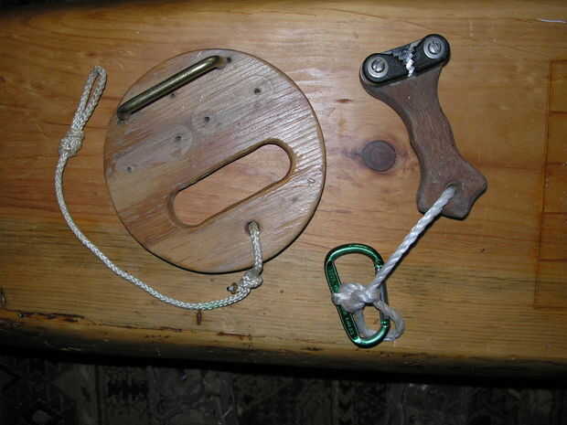 Más tarde, cuando construí mi proa, quería nuevas manos de tercera para uso ocasional. Construí la versión más esbelta en la izquierda de la foto de abajo. Dio un algo artístico (espero) forma que también se ofrece un buen agarre. Sin embargo, podría adivinar que es menos holdable que la simple versión redonda. Es cierto, pero estas manos terceras fueron Unidos en cada extremo de la cabina (Proa 101 lección: cambiar extremos cuando tack/derivación a proa, popa antiguo se convierte en nuevo arco, por lo que usted necesita duplicar cosas en cada extremo del barco). Colgaban en sus líneas de accesorio listos para usar para una variedad de propósitos, como se indicó anteriormente. Para ello, más aerodinamizado, artsy tercera manos estaban bien. No hay razón por qué estética no debe estar casada con ingeniería, de vez en cuando.