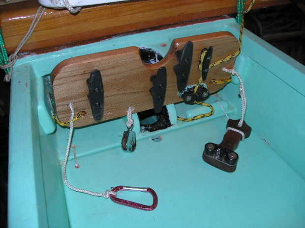 La Cala derecha y cam mantienen mi línea de timón (si golpeo algo, rápida liberación de la línea, o para lanzar desde aguas poco profundas, tirar la línea y garantizar en cuanto la profundidad es suficiente para que el timón). La siguiente es la cala vela Mesana tack Amura, a forma de vela buena tensión. El centro está la Cala de driza. La polea (bloque) es el bloque inferior de amura y la Cala izquierda es para la hoja de mesana. El mosquetón es por nada: mi cantina, GPS, línea de paleta y tal.