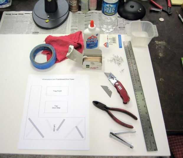 - impresión del archivo foamboard dados tower.pdf incluido con este instructable. 4 páginas, simplemente ol ' papel normal. Importante: al imprimir, asegúrese de que las páginas no se redimensionan en todas formas - visores de pdf siempre parecen querer reducir la página para adaptarse a. Ya si cabe, hay por lo menos 1/2" márgenes todo alrededor. Debe imprimir en tamaño de 100% para hacer las plantillas de trabajo.