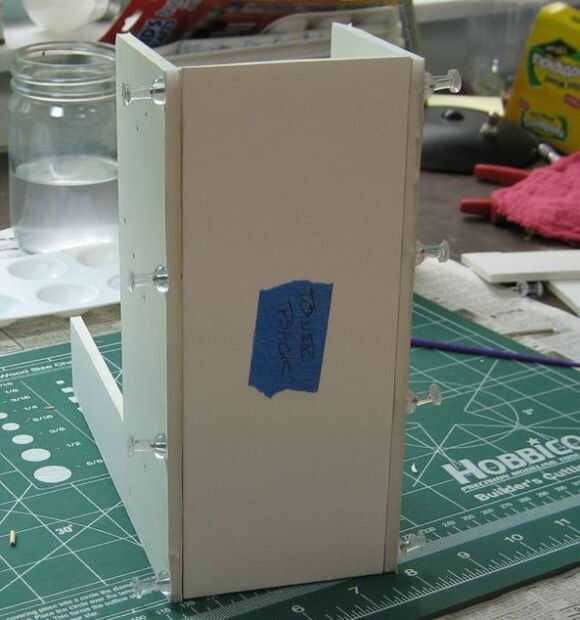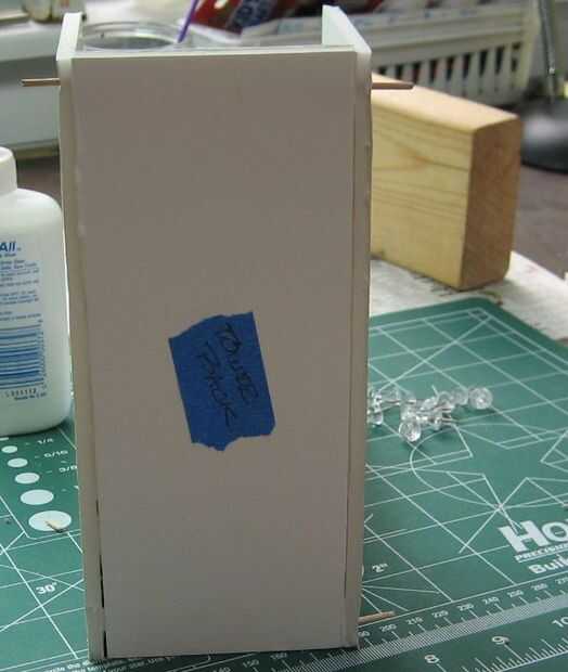 Alinee el borde superior con la parte superior de los lados de la torre. Iniciar la rutina de pegamento y palillos de dientes toda otra vez como la parte posterior, excepto que sólo hice tres agujeros por lado.