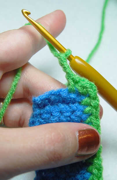 1. Acompaña el hilo verde en una esquina de la pulsera brazalete ganchillo solo uniformemente a través de uno de los lados largos de la pulsera.