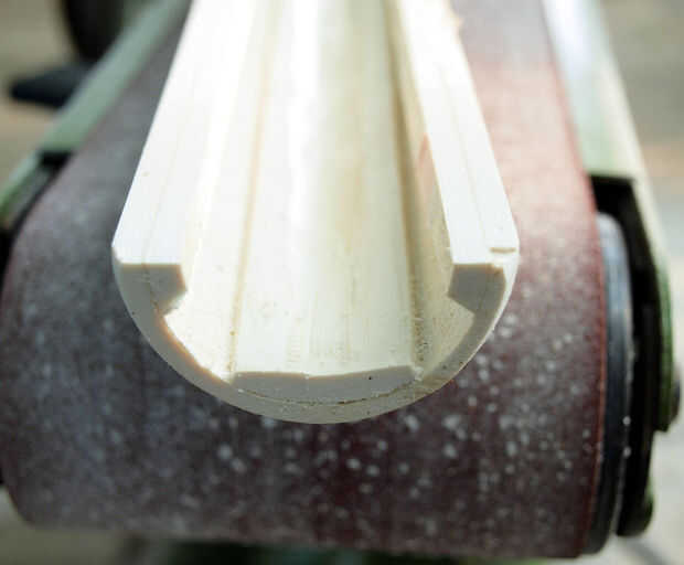 Después de que finalmente seca tuve que pulir los bordes de la pipa para obtener una superficie lisa. Lijadoras de banda trabajan mucho para el, que es hasta que el polvo de PVC se acumula debajo de la lija y comienza a vagar por todas partes. Lijado del PVC hace agradable polvo blanco para agregar a la estática. Y tienes que tener realmente cuidado de no hacerlo en caliente mientras está lijando si no se funda a la lija.