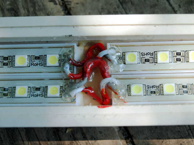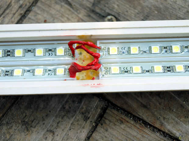 Una vez que el cuerpo de la pipa estaba listo empezaron a poner en el LED. Un nuevo problema apareció enseguida y era el hecho de que los cables de conexión eran largos y hay no suficiente espacio para ellos si quería los módulos LED cerca del espacio. Otra vez con hacer cosas la manera dura. Si quería encajar los mayoría posible de los módulos en el tubo tendría que acortar los cables. Esto significó que cortarlos y les soldadura de nuevo juntos. Qué dolor. Era un trabajo tedioso y delicado. Además ahora tenía que aislarlos para hacerlos impermeables. Si acababa de usar cinta aislante no sería suficiente un sello a prueba de agua. He intentado un aislamiento de caucho especial primero pero fue a voluminoso. Lo que terminé consiguiendo era una cinta aislante líquida que forma un sello apretado del agua y pinturas en. También es más flexible. Conseguí el color rojo porque.